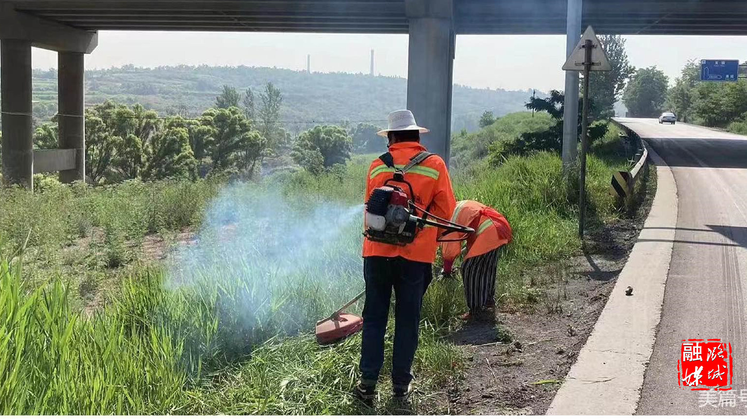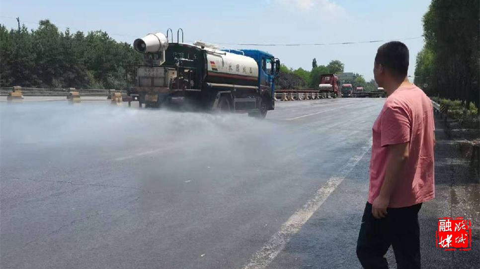 ▲区园林环卫中心相关负责人深入高速路口周边路段,实地督查道路洒水抑尘工作。