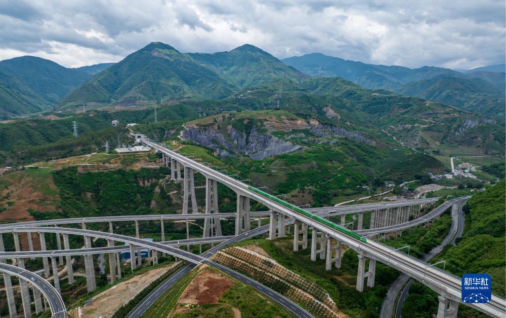 复兴号列车通过中老铁路南溪河特大桥(无人机照片,6月2日摄)。新华社记者 江文耀 摄