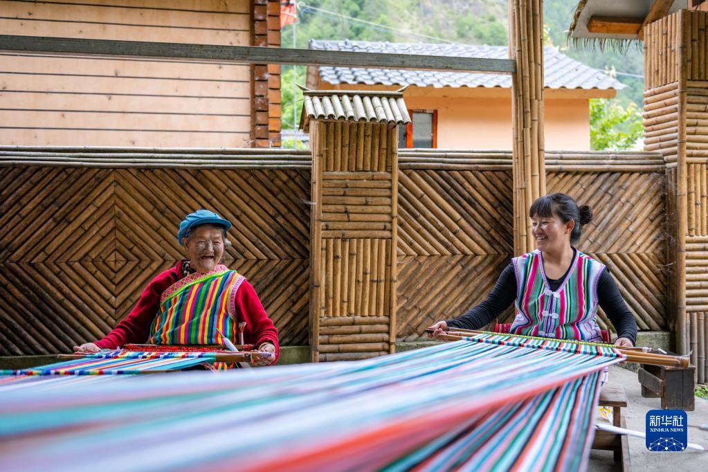 在云南省贡山独龙族怒族自治县独龙江乡迪政当村,独龙族老人李文仕(左)和女儿在编织独龙毯(5月10日摄)。新华社记者 曹梦瑶 摄
