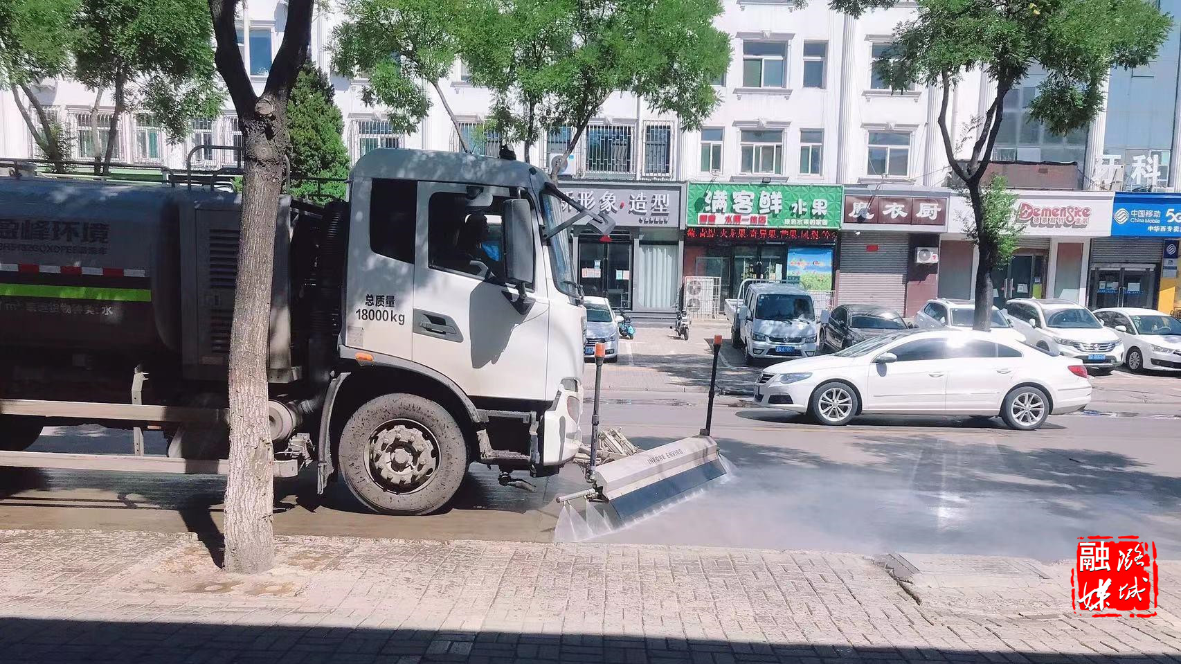 ▲区园林环卫中心对道路进行机械化清扫、洒水,确保路面湿润,减少道路扬尘污染,改善空气质量。