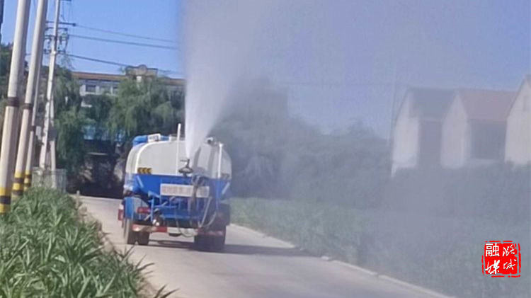 ▲微子镇对各村街巷路面进行洒水除尘,持续推进环境卫生整治工作。
