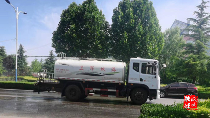 ▲区园林环卫中心对道路进行机械化清扫、洒水,确保路面湿润,减少道路扬尘污染,改善空气质量。