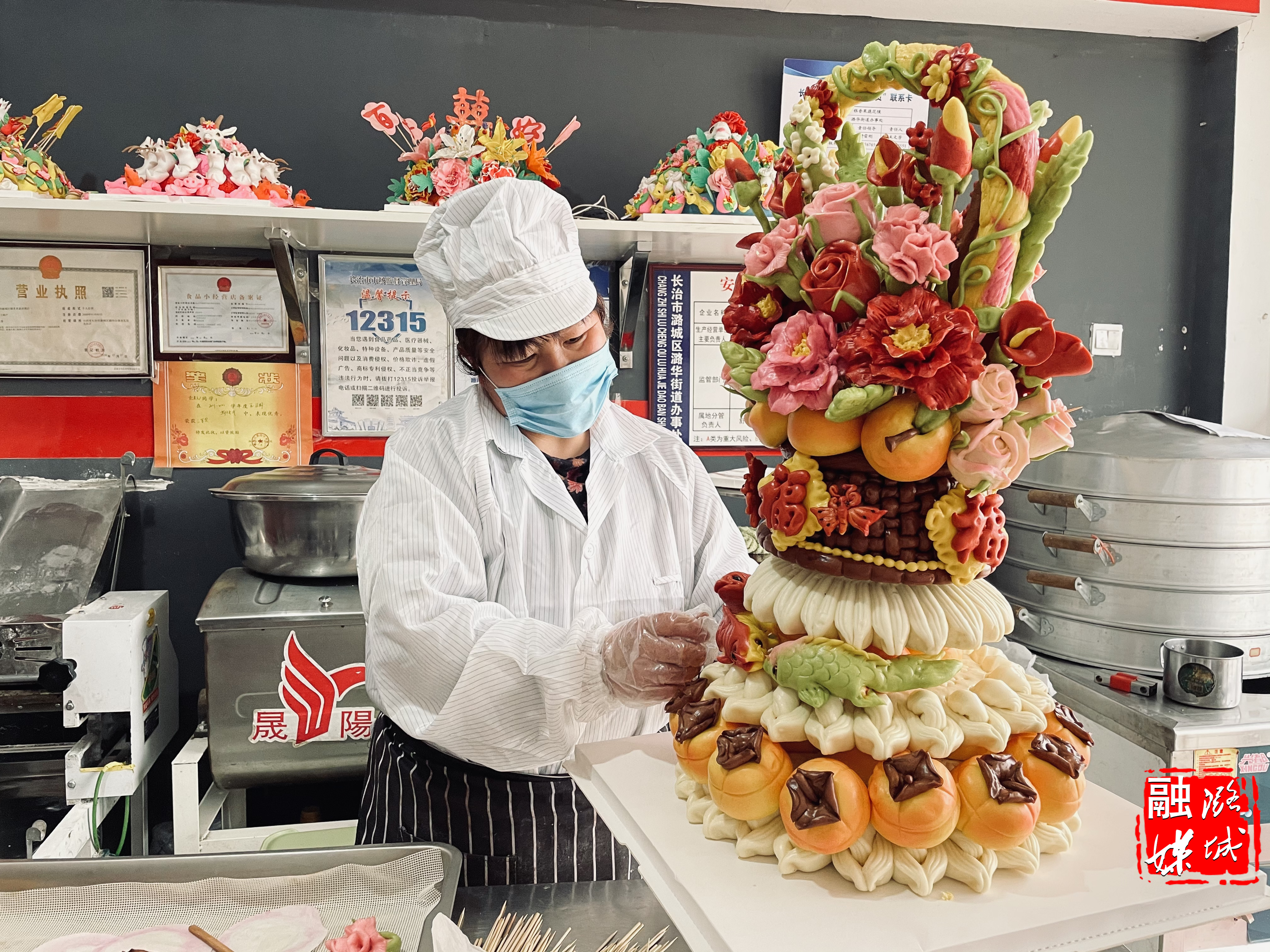 在潞华街道瓦窑头社区耿银香的果蔬花馍店里,摆放着许多独具匠心的花馍造型,既有龙凤呈祥、十里红妆,也有孔雀开屏、圆羊寿桃,造型逼真的吉祥图案震撼了每一个观望过它们的人,更记录着中国人对天地的敬畏,对吉祥的渴望,以及对福寿康宁的期盼。用耿银香的话来说就是:“花馍既好吃又好看,也是艺术品,人们对美好生活的向往和祝愿都在里面。”