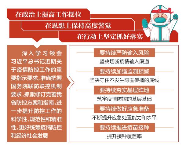 林武指出,当前,全国疫情总体处于低水平波动,我省疫情形势保持平稳。但要认识到,疫情防控如逆水行舟,越是疫情形势向好,越要保持清醒、如履薄冰。要深入学习领会习近平总书记近期关于疫情防控工作的重要指示要求,准确把握国务院联防联控机制要求,抓紧修订完善我省防控方案和指南,进一步提升防控工作的科学性、规范性和精准性,更好统筹疫情防控和经济社会发展。一要持续严防输入风险,进一步完善工作机制,用好“第一时间、第一落点”管控等行之有效的措施,坚决切断疫情输入渠道,牢牢掌握工作主动权。二要持续加强监测预警,坚持“点与面结合、症状监测与核酸检测结合、传染病监测系统与其他部门监测系统结合”原则和“四早”要求,完善升级多点触发监测预警响应系统,扎实抓好社会面常态化核酸筛查,坚决守住不发生隐匿传播的底线。三要持续夯实基层阵地,科学统筹配置一线防控力量,加强对防疫人员的关心关爱,充分调动村(社区)等广大基层组织的积极性,筑牢疫情防控的基层基础。四要持续做好应急准备,健全完善平急一体化突发疫情应急指挥体制,强化应急培训演练,科学统筹使用方舱医院等防控设施,不断提升应急处置能力和水平。五要持续推进疫苗接种,坚持“政府找人、行业动员、卫健打苗”工作模式,实施敲门行动,扎实细致做好60岁以上老年人的疫苗接种工作,提升接种覆盖率。
