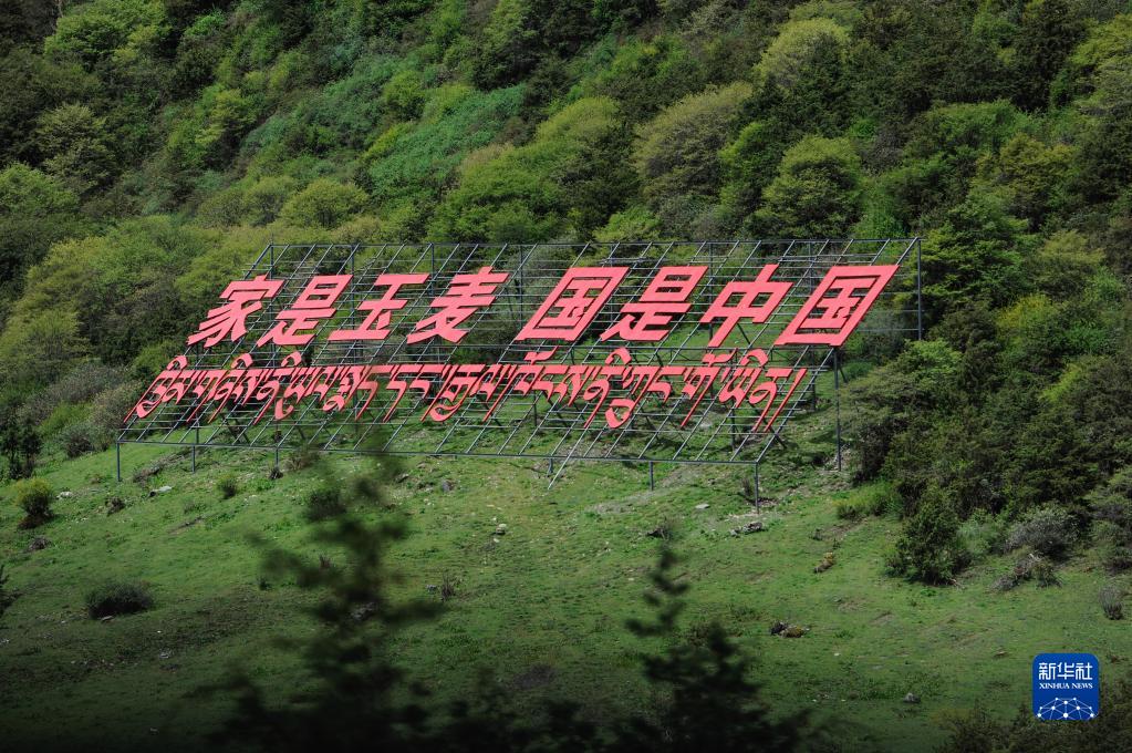 玉麦乡山坡上的标语(6月1日摄)。新华社记者 张汝锋 摄