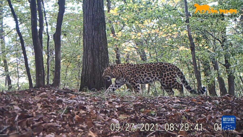 这是2021年9月27日利用“天地空一体化监测系统”在东北虎豹国家公园内监测到的野生东北豹影像(视频截图)。新华社发