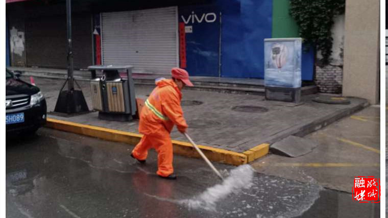 ★7月12日,区园林环卫中心工作人员对雨后路面积水进行清理。