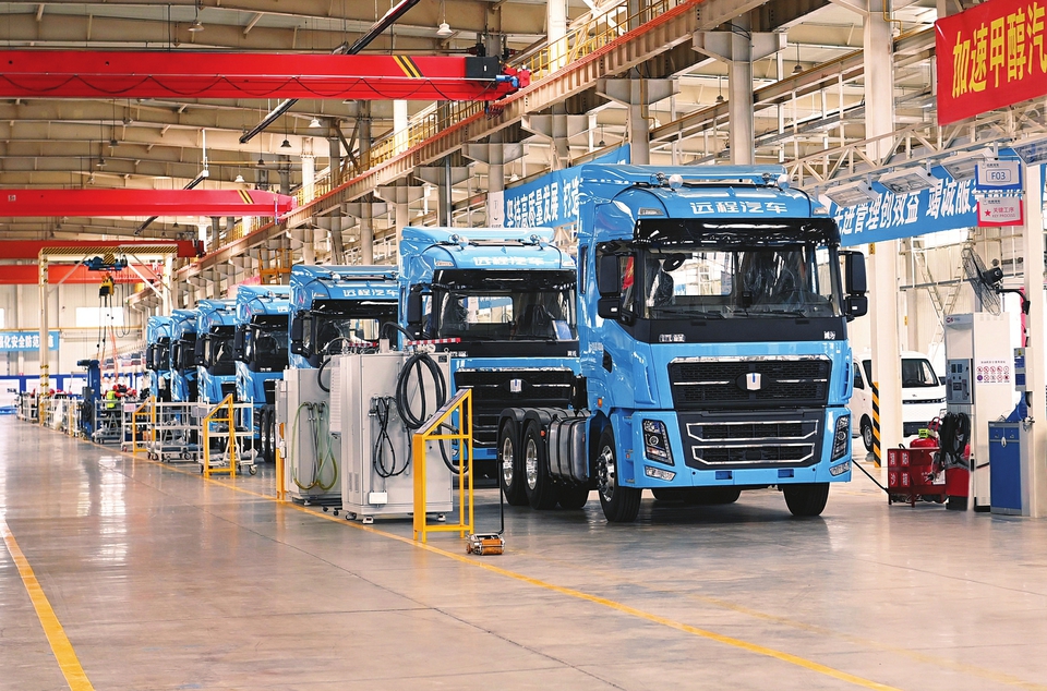 吉利远程新能源商用车晋中基地生产的第二代甲醇重卡,动力上搭载了全新自主开发的13L甲醇发动机,动力更强,能耗进一步降低,同时满足国六排放标准。 本报记者史晓波摄