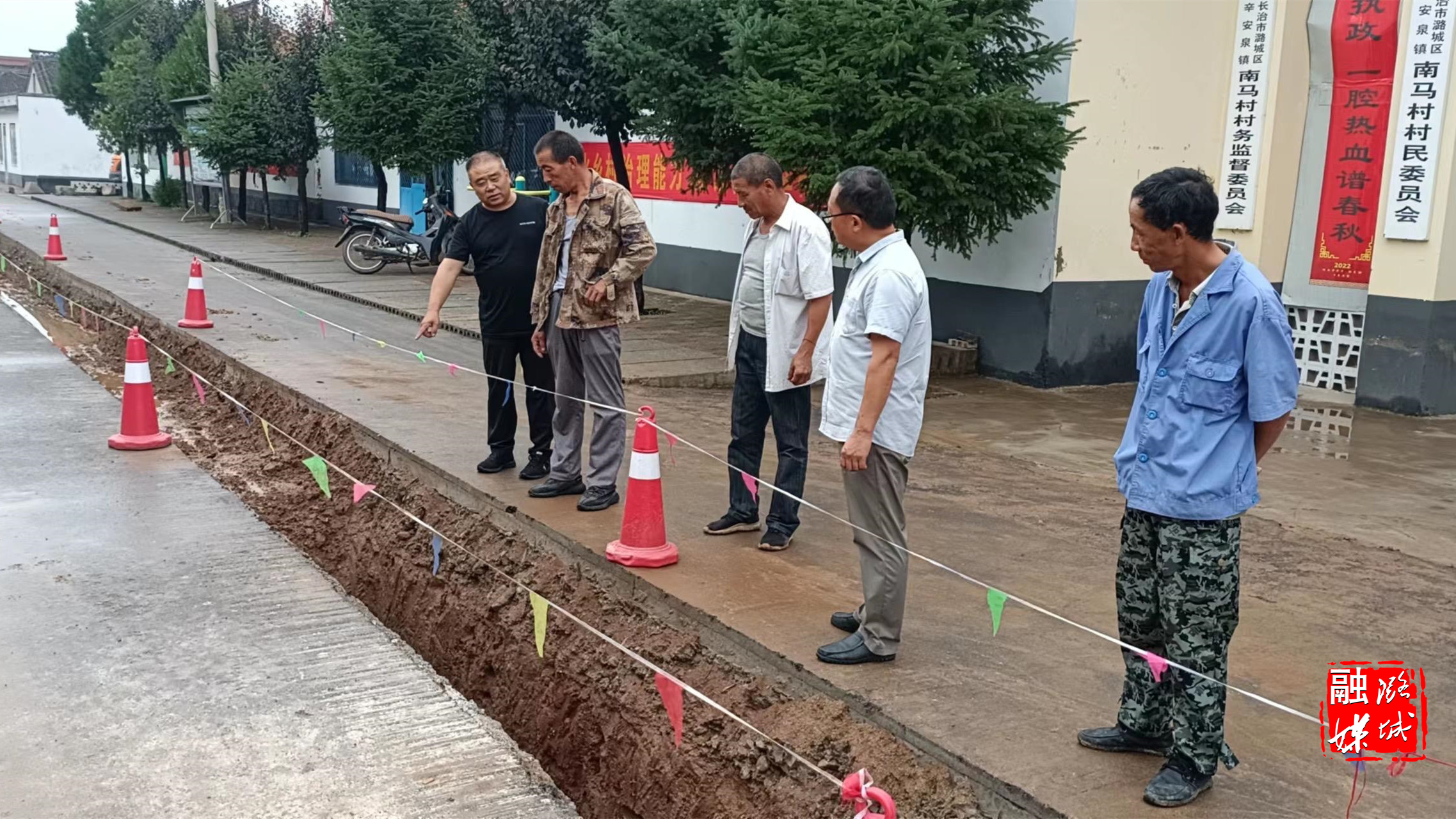 ★7月16日,辛安泉镇相关负责人在南马村查看污水管网铺设工程进展情况。