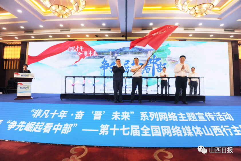 山西日报新媒体记者刘妍报道 7月18日,“非凡十年·奋‘晋’未来”系列网络主题宣传活动暨“争先崛起看中部”——第十七届全国网络媒体山西行主题活动在太原启动。省委常委、宣传部部长吴伟宣布主题宣传活动启动,并与中央网信办传播局副局长陈仁泽共同为媒体采访团授旗。吴伟、陈仁泽和省委宣传部主持日常工作的副部长宋伟、省委网信办主任董晓林、省直工委主持日常工作的副书记薛荣共同按下启动装置。