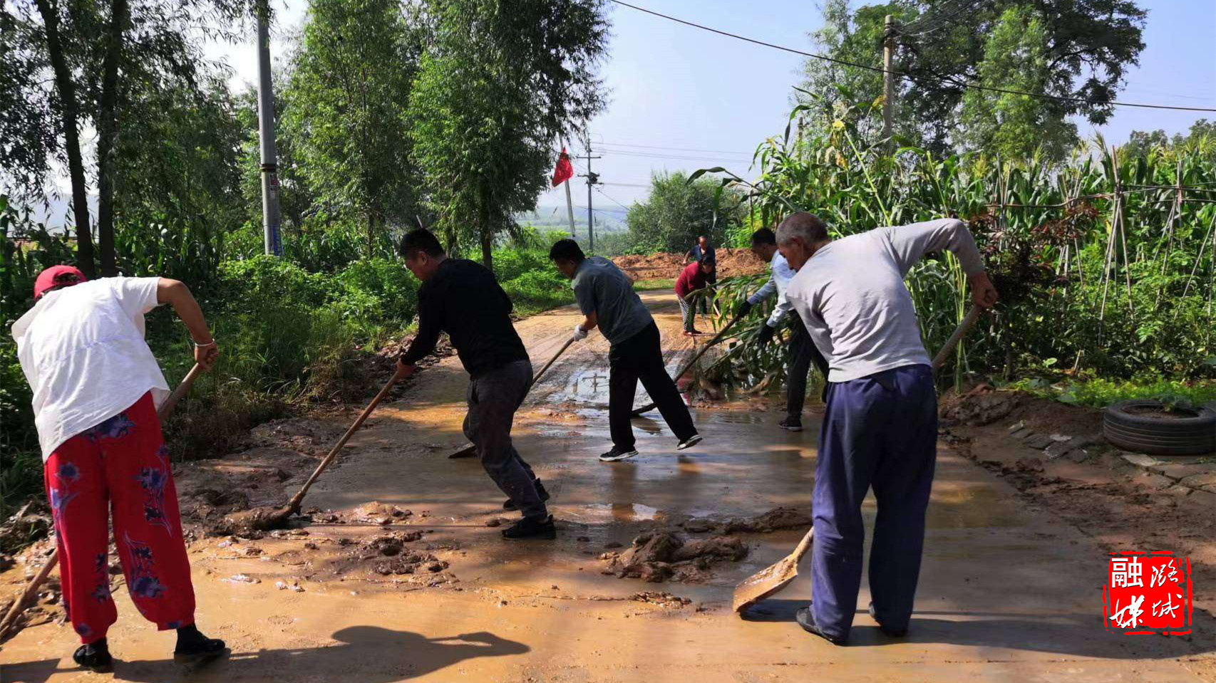 ▲店上镇各村工作人员对雨后路面淤泥进行清理。