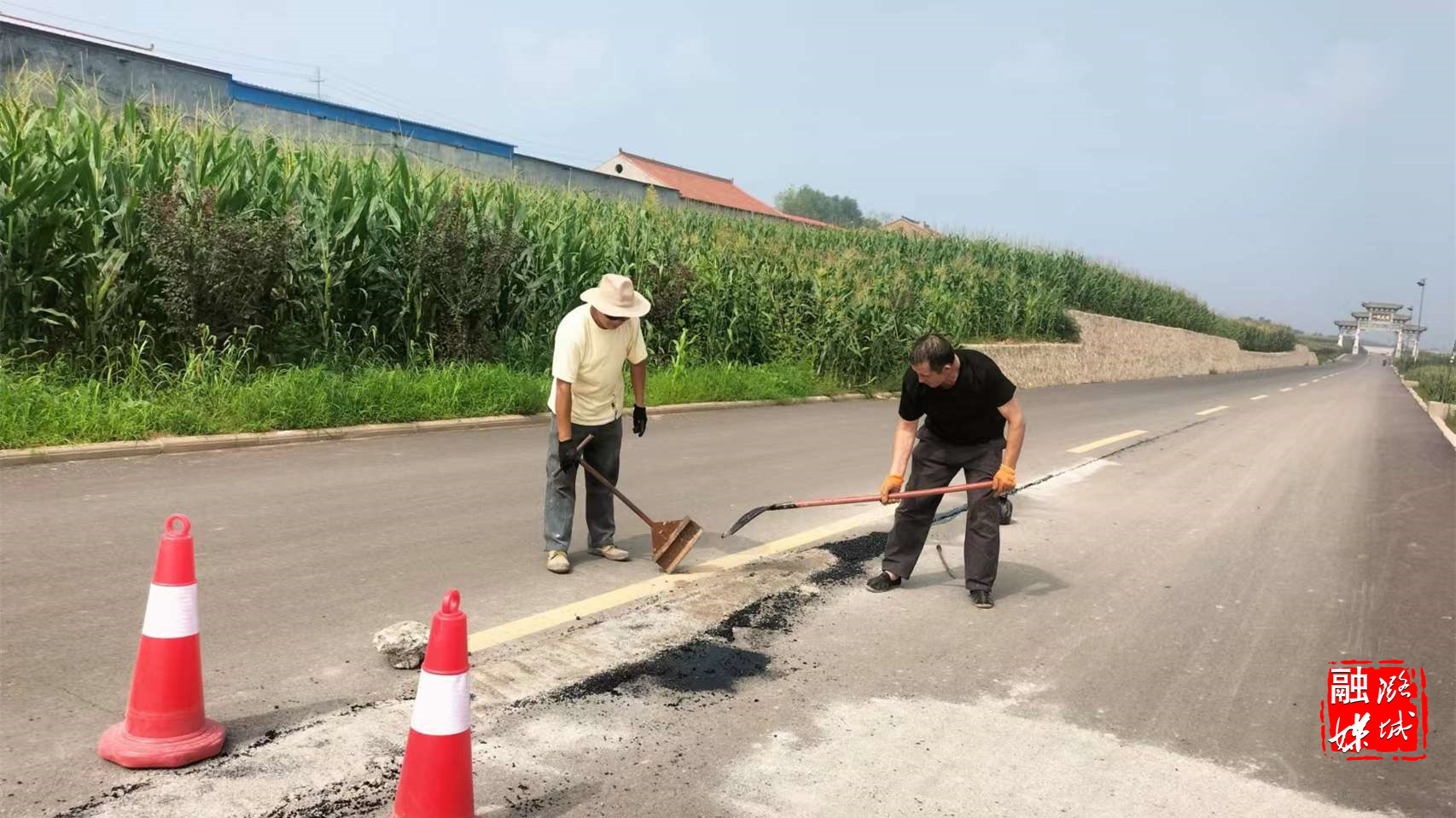 ★7月31日,店上镇下栗村工作人员抢修村内破损道路,确保群众安全出行。