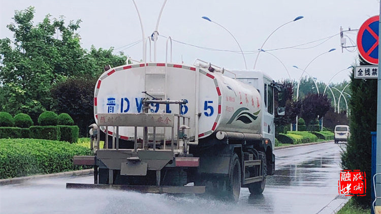 ▲区园林环卫中心出动机扫车、洒水车等特种作业车辆进行洗扫和洒水作业。