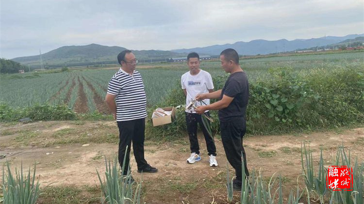 ★9月3日,微子镇相关负责人在王都庄村查看经济合作社种植大葱的长势情况。