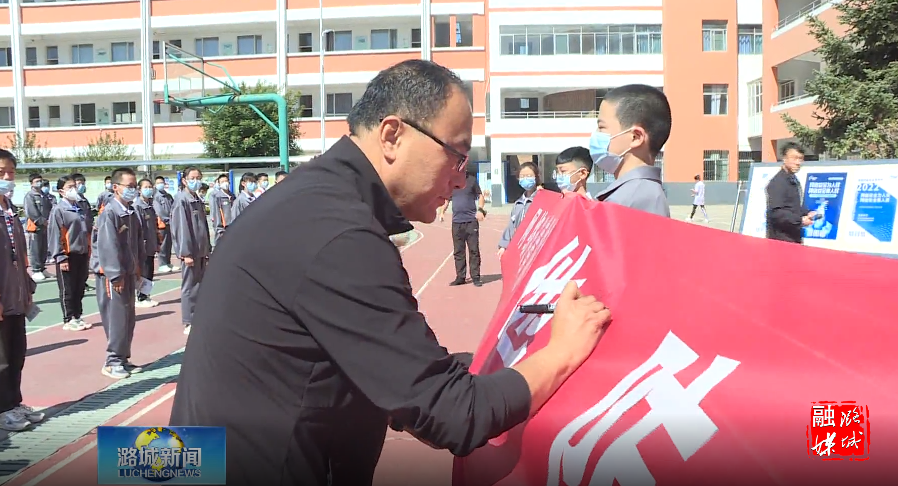 活动中,学生们举起右拳,庄严宣誓,掷地有声的誓词在校园上空回荡,充分展示了中学生朝气蓬勃、积极向上的精神状态。宣誓结束后,大家依次在“网络连着你我他 防骗防盗两手抓”条幅上签名。