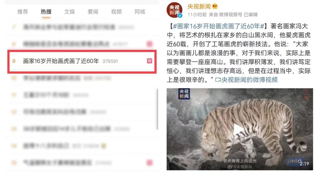 截至10月6日,#70岁画家为国画曾遍访名山大川##画家用国画记录苏翊鸣夺金时刻##他从理发店学徒变成国画艺术家##花鸟画家的启蒙之地就像鲁迅的百草园##画家16岁开始画虎画了近60年#等节目话题相继登上微博热搜,相关内容全网阅读、视频播放、触达人次等数据破3亿。