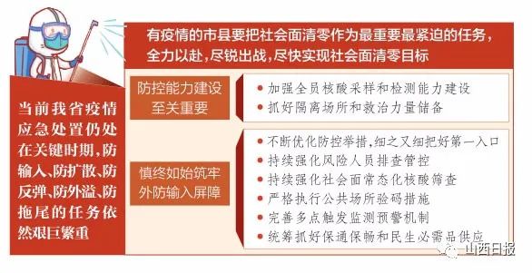 他强调 坚持应急处置和外防输入两手抓两到位 加快实现全省疫情形势根本性好转 山西日报记者杨文报道 10月31日,省委书记林武主持召开省委第114次疫情防控专题会暨省疫情防控工作领导小组会议,分析研判当前疫情形势,对下一步防控工作进行安排部署。他强调,要深入学习贯彻党的二十大精神和习近平总书记关于疫情防控重要指示精神,坚决落实疫情防控总策略、总方针,坚持应急处置和外防输入两手抓两到位,加紧推进局部社会面动态清零攻坚,加快实现全省疫情形势根本性好转,坚决有力打赢这场阻击战歼灭战。省委副书记、省长蓝佛安提出具体要求。省委副书记商黎光,省领导张吉福、陈安丽、李凤岐、吴伟、卢东亮、韦韬、郑连生、张复明、贺天才、刘旸、孙洪山、汤志平出席会议,于英杰通报有关情况。 林武指出,当前我省疫情应急处置仍处在关键时期,防输入、防扩散、防反弹、防外溢、防拖尾的任务依然艰巨繁重。有疫情的市县要把社会面清零作为最重要最紧迫的任务,全力以赴,尽锐出战,尽快实现社会面清零目标。要在科学流调基础上,适度扩大筛查范围,以最快时间追阳断链,确保风险区域和风险人员全覆盖。要严格落实社会面管控各项措施,抓好基层社区防控工作,帮助群众做好家庭环境消杀,最大限度防止发生续发交叉感染。林武指出,面对传染性隐匿性更强和代际间隔更短的奥密克戎最新变异株,防控能力建设至关重要。要加强全员核酸采样和检测能力建设,分类精准实施单管或混采核酸检测,从技术上强化流调溯源精准度,持续提升隔离转运效率,抓好隔离场所和救治力量储备,集聚更多资源补齐防控能力短板。林武强调,在全力抓好局部疫情应急处置的同时,必须慎终如始筑牢外防输入屏障。要不断优化防控举措,细之又细把好第一入口,持续强化风险人员排查管控,持续强化社会面常态化核酸筛查,严格执行公共场所验码措施,完善多点触发监测预警机制,统筹抓好保通保畅和民生必需品供应,确保限时实现社会面动态清零和社会秩序稳定。 林武指出,要持续加强学校、医院、大型商超、农贸市场、开发区企业、城乡结合部等重点部位的疫情防控工作。要把确保校园绝对安全作为疫情防控的重中之重,压实学校和属地联防联控责任,建立健全定期研判会商处置等工作机制,具备封闭条件的学校一律实施闭环管理,坚决守牢校园安全防线。学校所在地一旦发生疫情,不具备封闭条件的学校要根据实际情况及时调整教学模式,最大限度避免疫情风险进入校园。要抓实抓细校园常态化防控工作,严格执行核酸筛查和健康监测等要求,强化校内学习生活服务保障,注重学生心理疏导,及时回应师生关切。 林武强调,基层是疫情防控的“最后一公里”。各县(市、区)党政主要负责同志要挺在防控一线,盯紧突出问题和各个环节,加强工作统筹,狠抓工作落实。分管负责同志要把主要精力投入疫情防控,做到心中有数、脑中有策、手上有招。各级党组织和广大党员干部要紧紧依靠群众,广泛发动群众,持续夯实联防联控、群防群控、严防严控的基层基础。要加强对一线防疫人员的政策业务培训,给予他们更多关心关爱,使大家都能始终以昂扬状态投入疫情防控工作。 蓝佛安指出,各级各部门要深入学习贯彻党的二十大精神,按照省委“早、快、准”要求,坚持外防输入、内防反弹并重,落实“精准流调+严格管控+核酸检测”等措施,突出重点针对性提高核酸检测效率,进一步织密织牢外防输入网络,全力以赴坚决打赢动态清零攻坚战。要在狠抓防疫的同时,复盘检点今冬明春保暖保供工作,因地制宜、稳妥有序推进“煤改气”“煤改电”,多措并举稳定煤源气源电源,优先保障民生取暖用能需求,确保群众温暖过冬。要高效统筹疫情防控和经济社会发展,持续做细做实项目前期,积极运用“三区三线”划定成果,加快释放土地等资源要素,推进形成更多实物工作量,强化交通物流保通保畅,为全方位推动高质量发展提供有力支撑。 会议以视频方式召开。省疫情防控工作领导小组成员单位负责同志在省主会场参加会议。各市、县(市、区)设分会场。