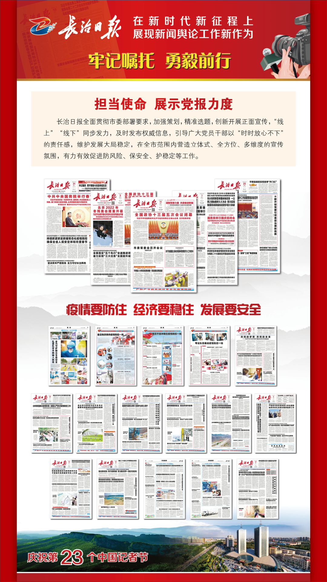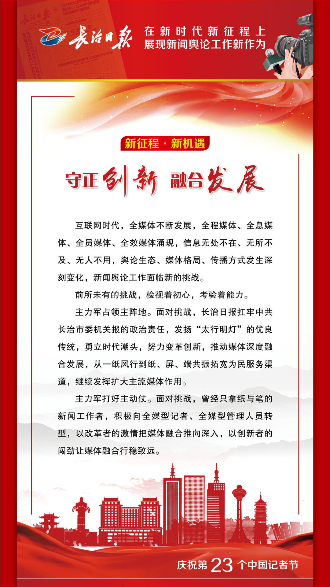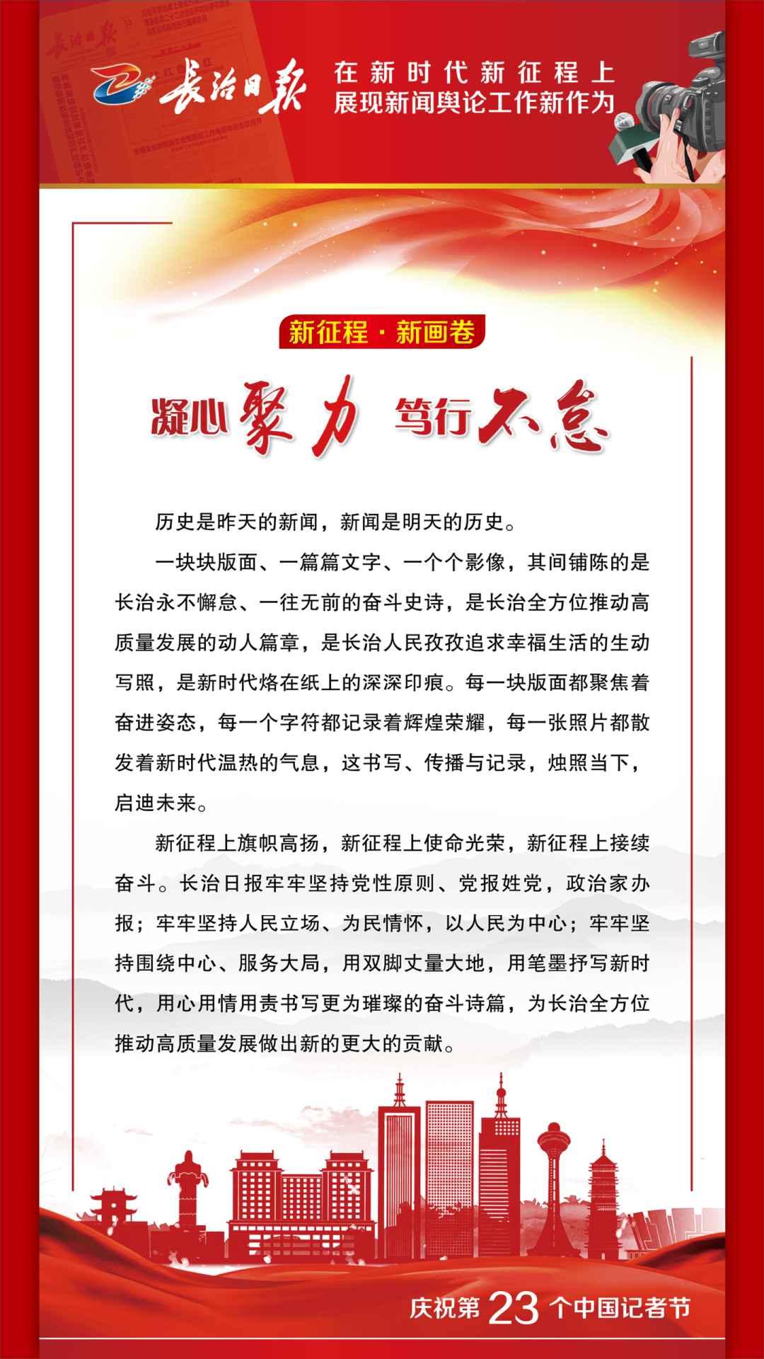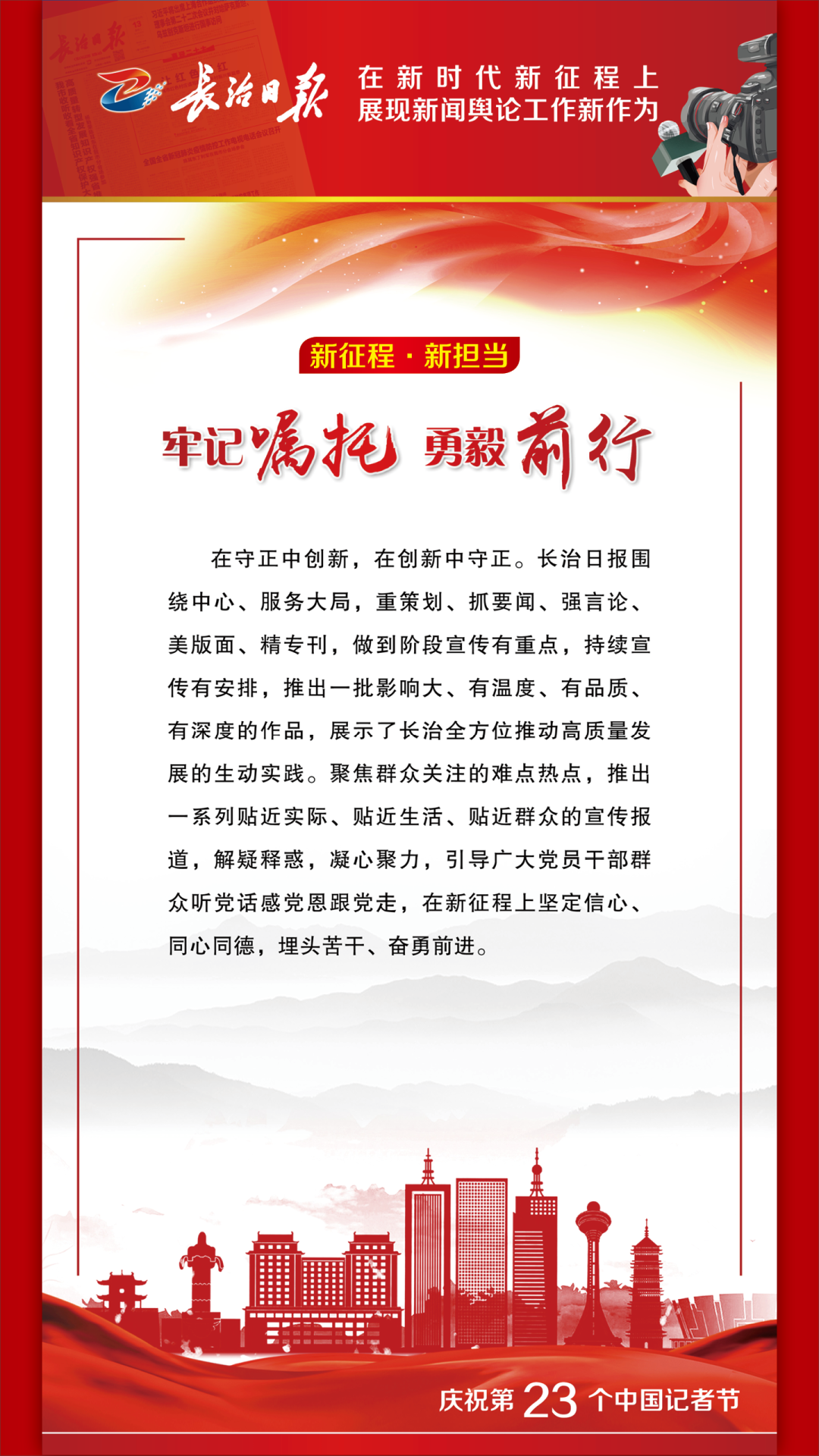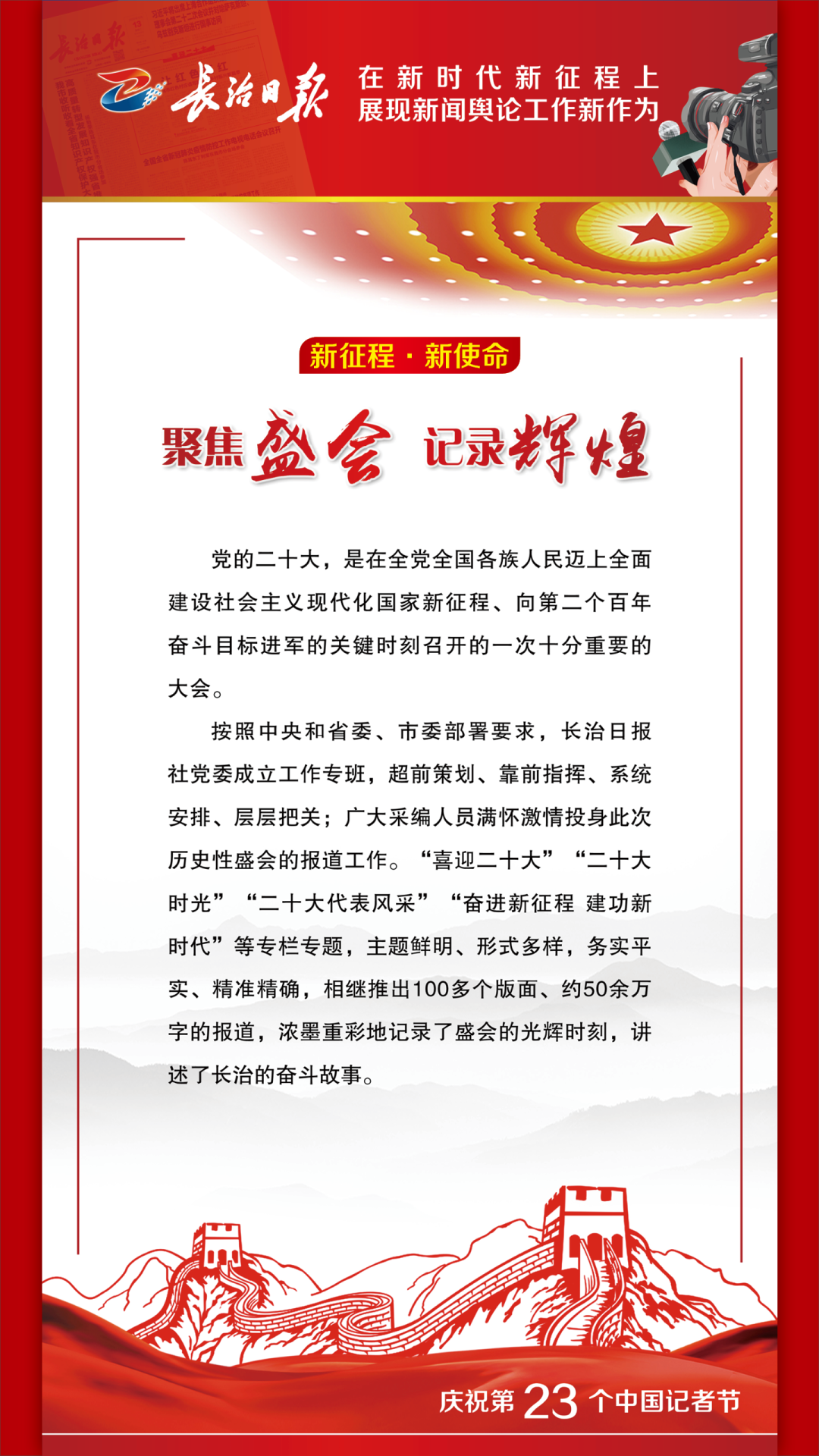 踔厉奋发书华章,乘势而上向未来。当前和今后一个时期,学习宣传贯彻党的二十大精神是我们的首要政治任务。我们将以对党的绝对忠诚,以更加昂扬奋进的姿态,持续讲好新时代长治故事、传播好新时代长治声音,为长治全方位推动高质量发展做出新的更大的贡献。 1 来源丨长治日报