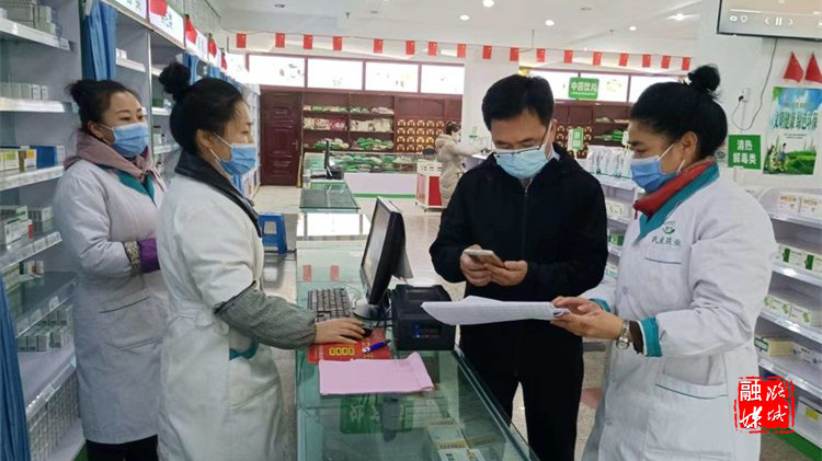 ▲区市场监管局负责人对山晋民康药店、唐古小镇等门店疫情防控措施落实情况进行检查。