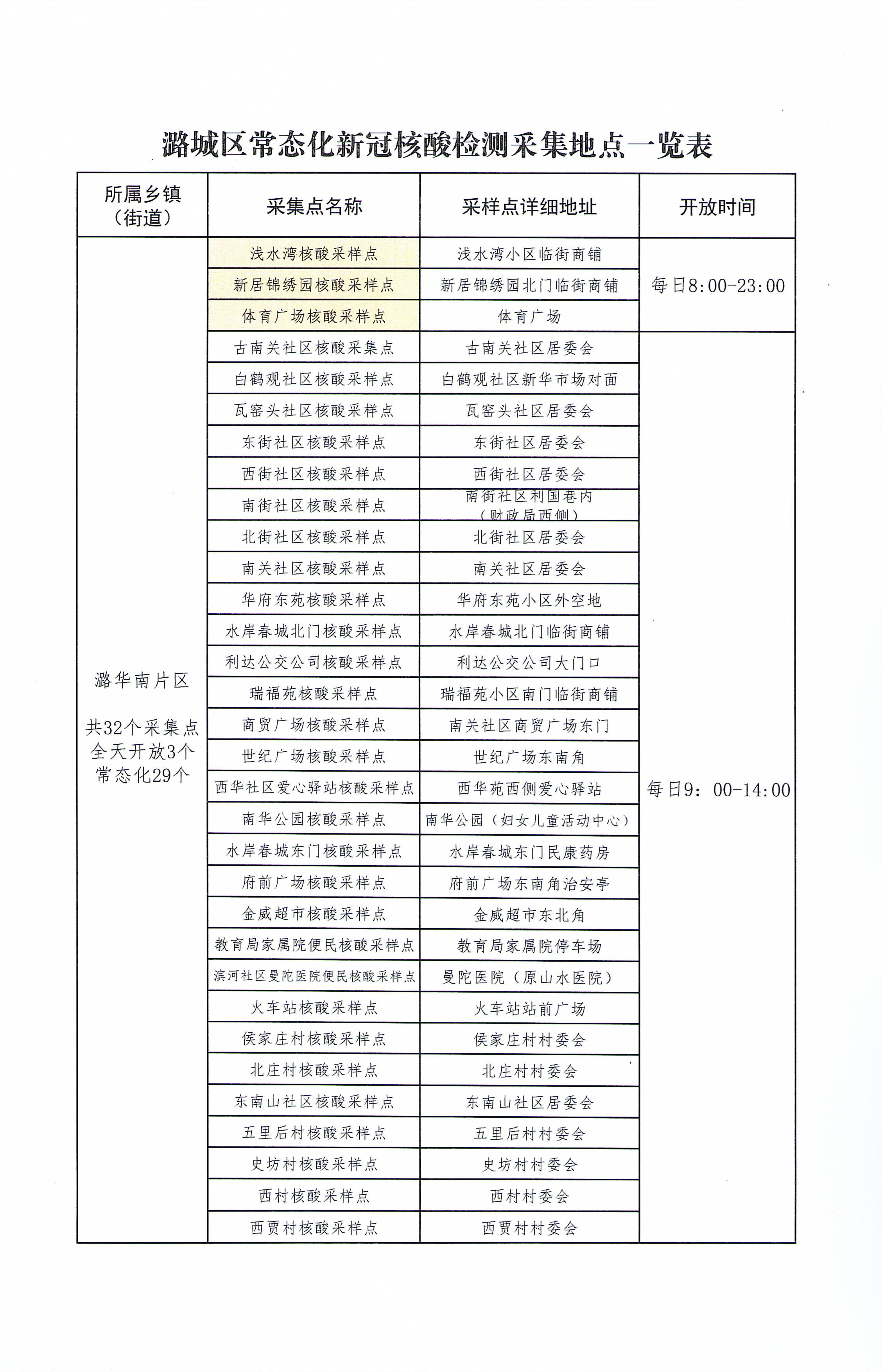 2.潞华街道南片开放29个常态化核酸采样点位(开放时间为9:00-14:00,免费检测),承担本点位常态化核酸筛查任务。