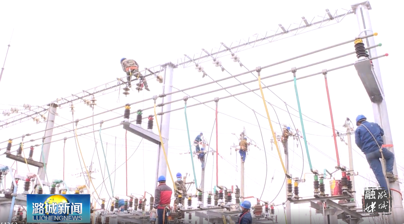 在潞河变电站,国网潞城区供电公司的施工人员各自的岗位上忙碌着,有的在杆上架线作业,有的进行拉线制作,有条不紊地实施着电力改造作业。