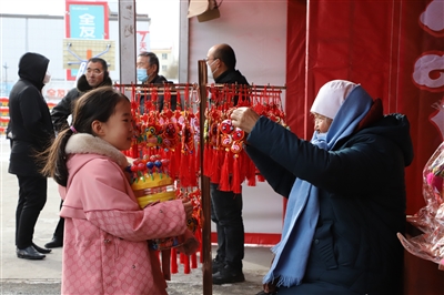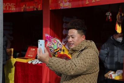 在火红的威风锣鼓表演中,活动正式拉开帷幕。兔年挂饰、现炸肉丸、米面粮油、特色甩饼、各类土特产品......在整齐排列的火红展位里,记者见到了琳琅满目的年货和熙熙攘攘的购物人群。