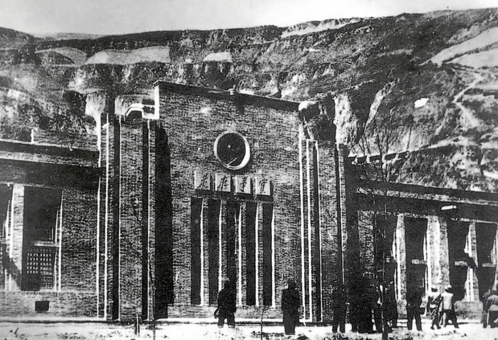 ↑这是1943年11月在延安落成的中共中央党校大礼堂。礼堂正面墙上镌刻着毛泽东的题词“实事求是”。
