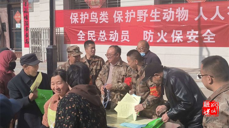 ▲微子镇相关负责人在辖区主街道、学校、九小场所宣传森林防火和野生动物保护常识。