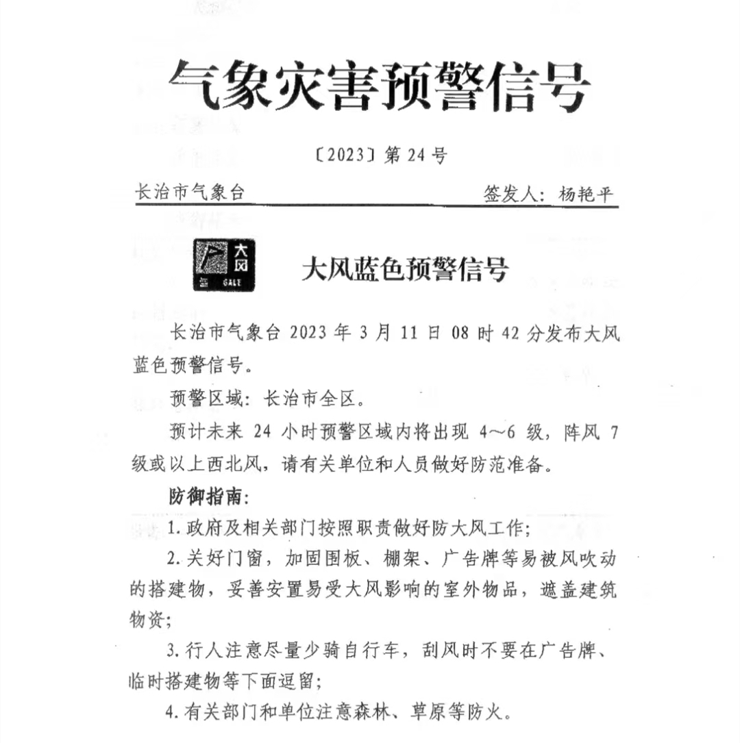 长治市气象台 2023年3月11日08 时42分发布大风蓝色预警信号