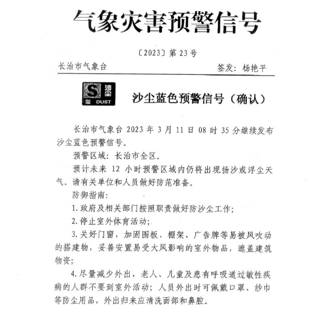 长治市气象台 2023年3月11日08 时35分继续发布沙尘蓝色预警信号
