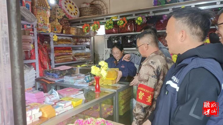 ▲史回镇工作人员同区市场监督局到部分村督查销售易燃祭祀用品情况。