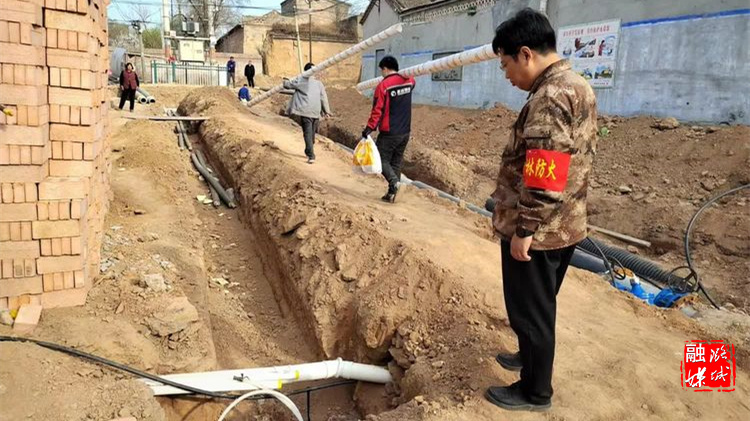 ★3月30日,微子镇相关负责人在王都庄村查看集中供暖工程施工进度。