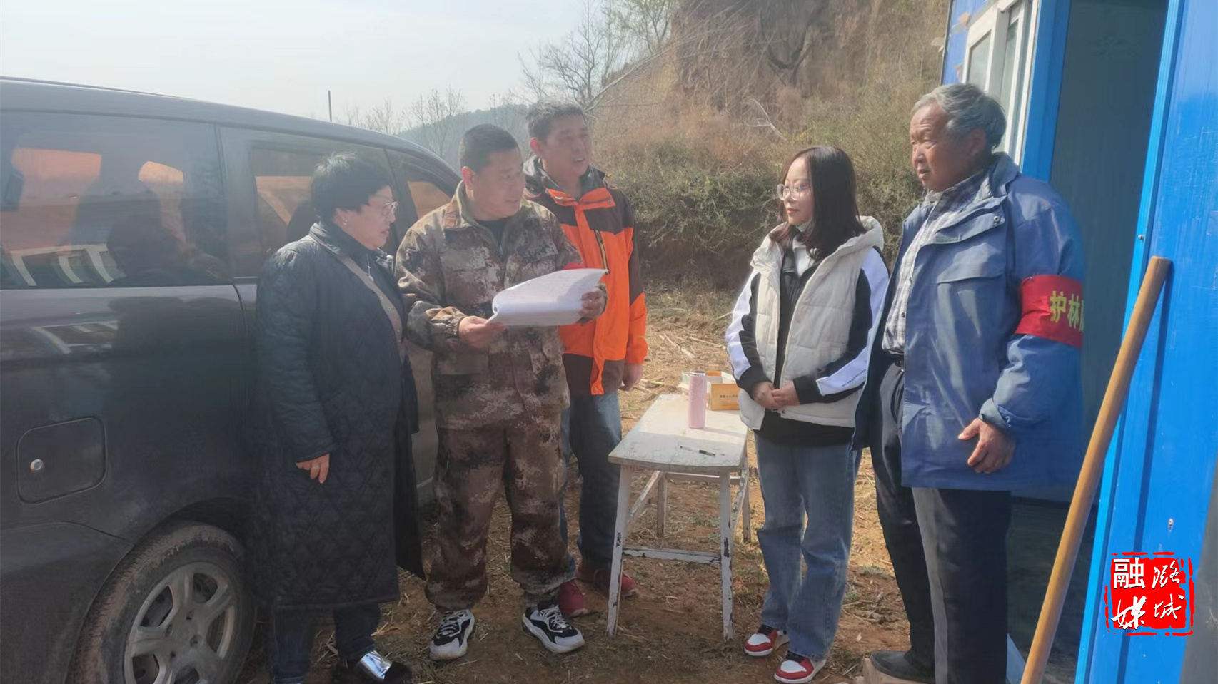 ▲区融媒体中心工作人员在包联村开展护林防火值班值守工作。