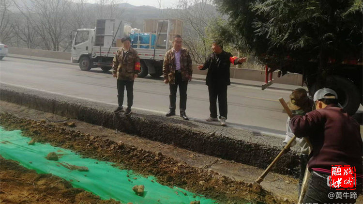 ★4月7日,黄牛蹄乡相关负责人在324省道沿线查看绿化种植情况。