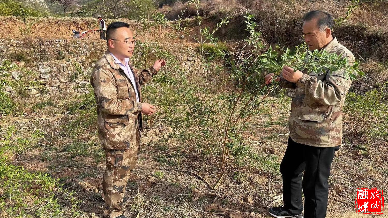 ★4月18日,黄牛蹄乡负责人到辛安村南花辿片区查看连翘种植情况。