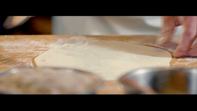 将面团擀制成面饼后,搭在擀面杖上,手腕用力,随着面的劲头,轻巧地甩过去。