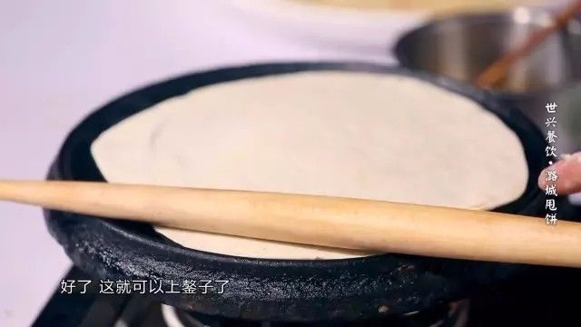 甩好的面饼及其薄透,大小也和鏊子差不多,刚好可以把鏊子盖住。饼上鏊子后,刷纯驴油、撒葱花,继续烙制。