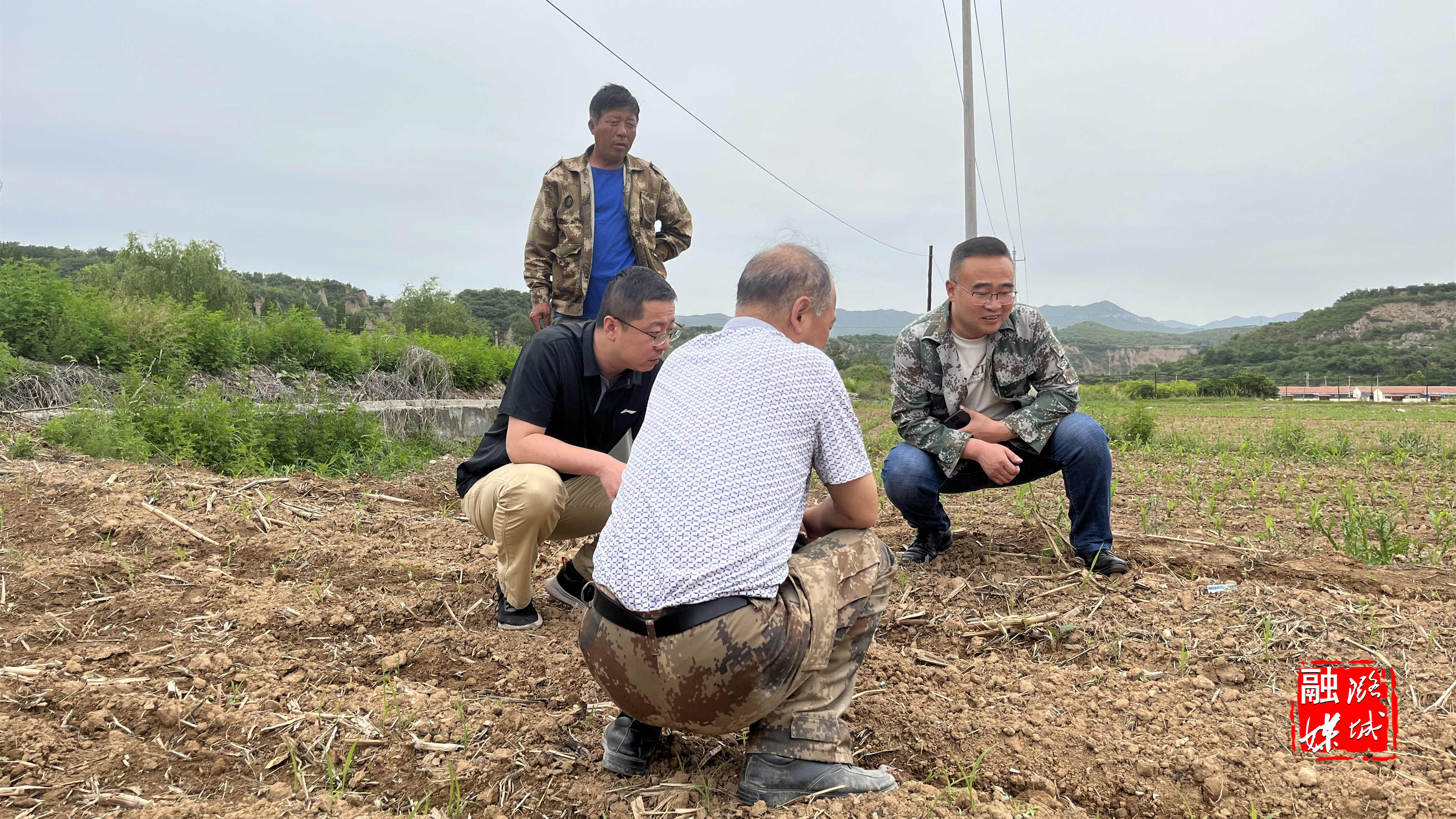 ★6月2日,黄牛蹄乡相关负责人在土脚村查看玉米、高粱等农作物出苗情况。