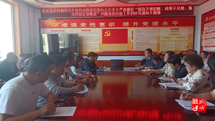 ★6月9日,区农业农村局召开机关工作会议,集中学习了《中共山西省纪委办公厅关于严肃做好“新官不理旧账、政策不兑现、拖欠民营企业账款”问题清查自查工作的补充通知》精神。