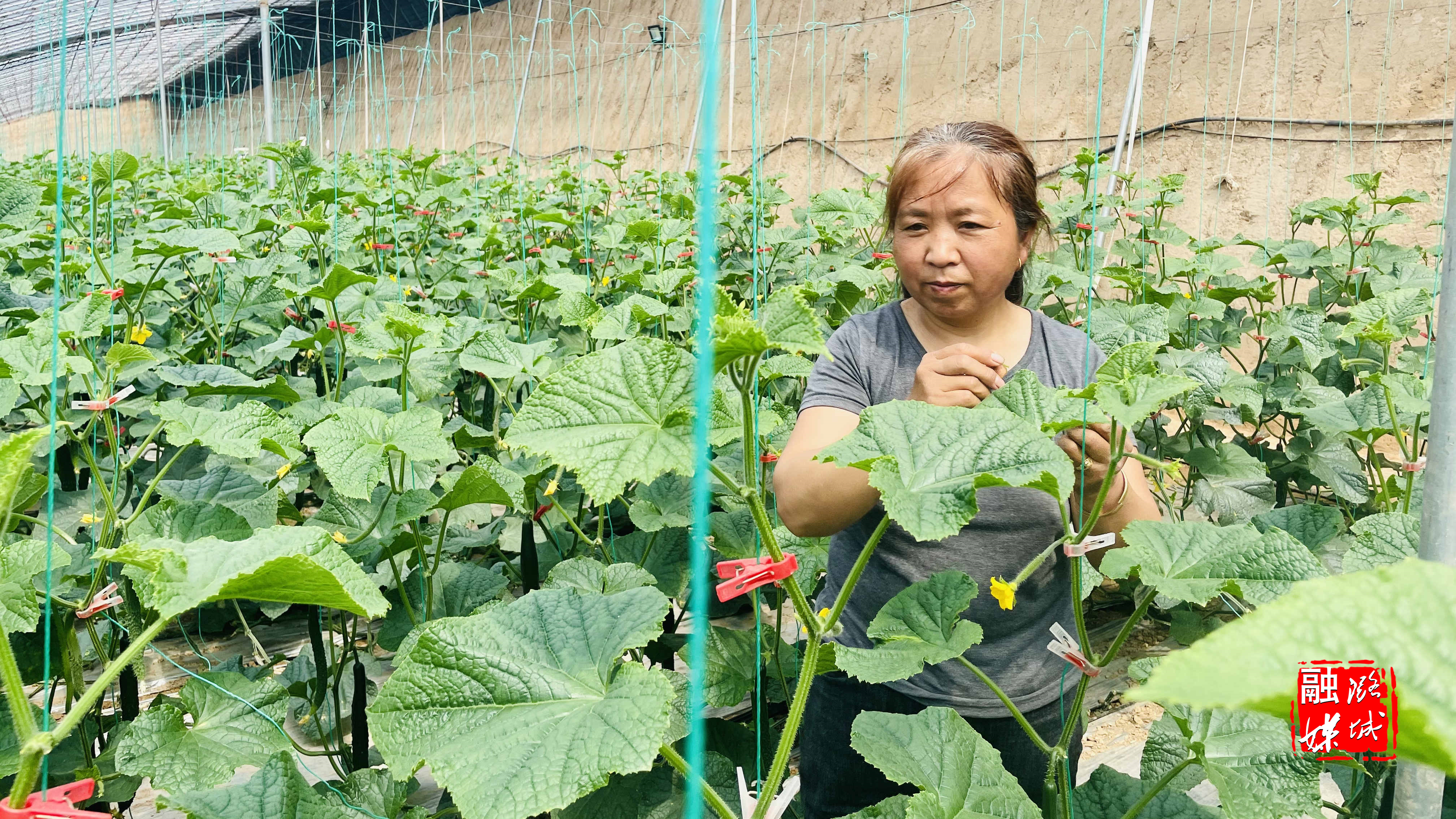 穿过两米长的缓冲通道,岭后村村民杨计梅种满黄瓜的大棚地整齐地令人眼前一亮,与素日里见到的植物爬藤架有所不同,杨计梅把竹竿换成了成本更低、方便采摘的普通长绳。为了方便打理,细心的杨计梅还用夹子将长绳与藤蔓固定在一起。杨计梅告诉记者,这法子是从申建明那里学来的。