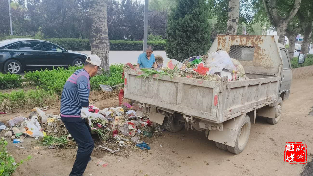 ▲史回镇各村组织工作人员清扫绿化带内漂浮垃圾。