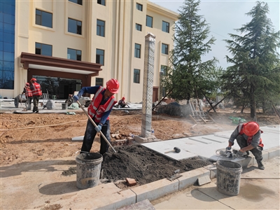 在基地1号楼前,工人师傅们争分夺秒,全力冲刺,正紧张有序地进行道路改造升级、院内景观打造、设备安装调试等后续工程,确保和平康复医院于7月1日具备试运营条件。