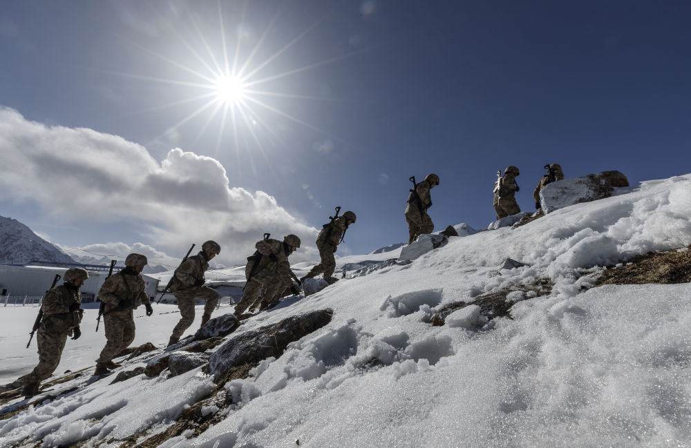 位于帕米尔高原的新疆军区某边防团红其拉甫边防连的战士在巡逻(2023年4月13日摄)。新华社记者 费茂华 摄